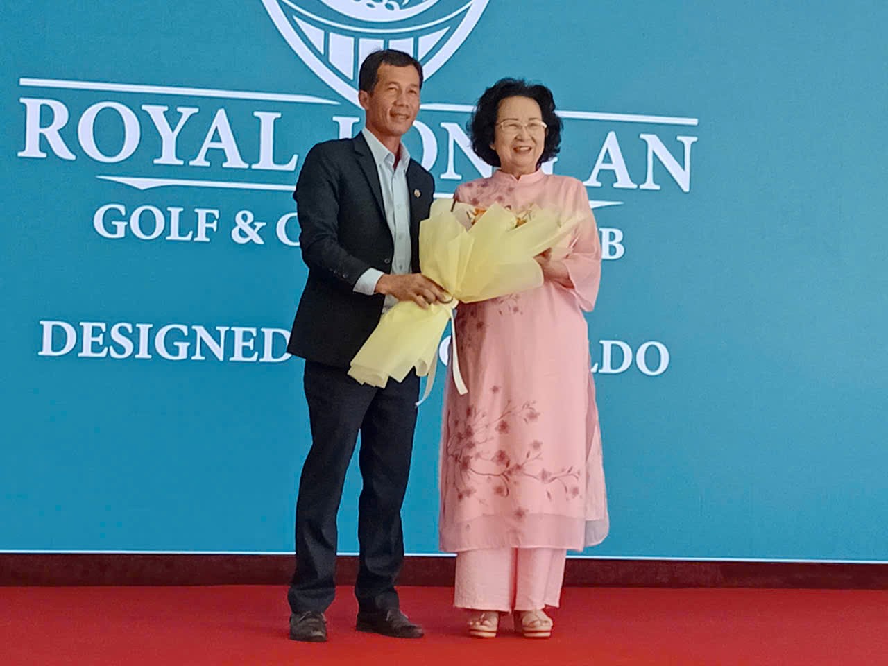 Lãnh đạo doanh nghiệp tặng hoa Chủ tịch Hội Liên hiệp VHNT Tây Ninh.