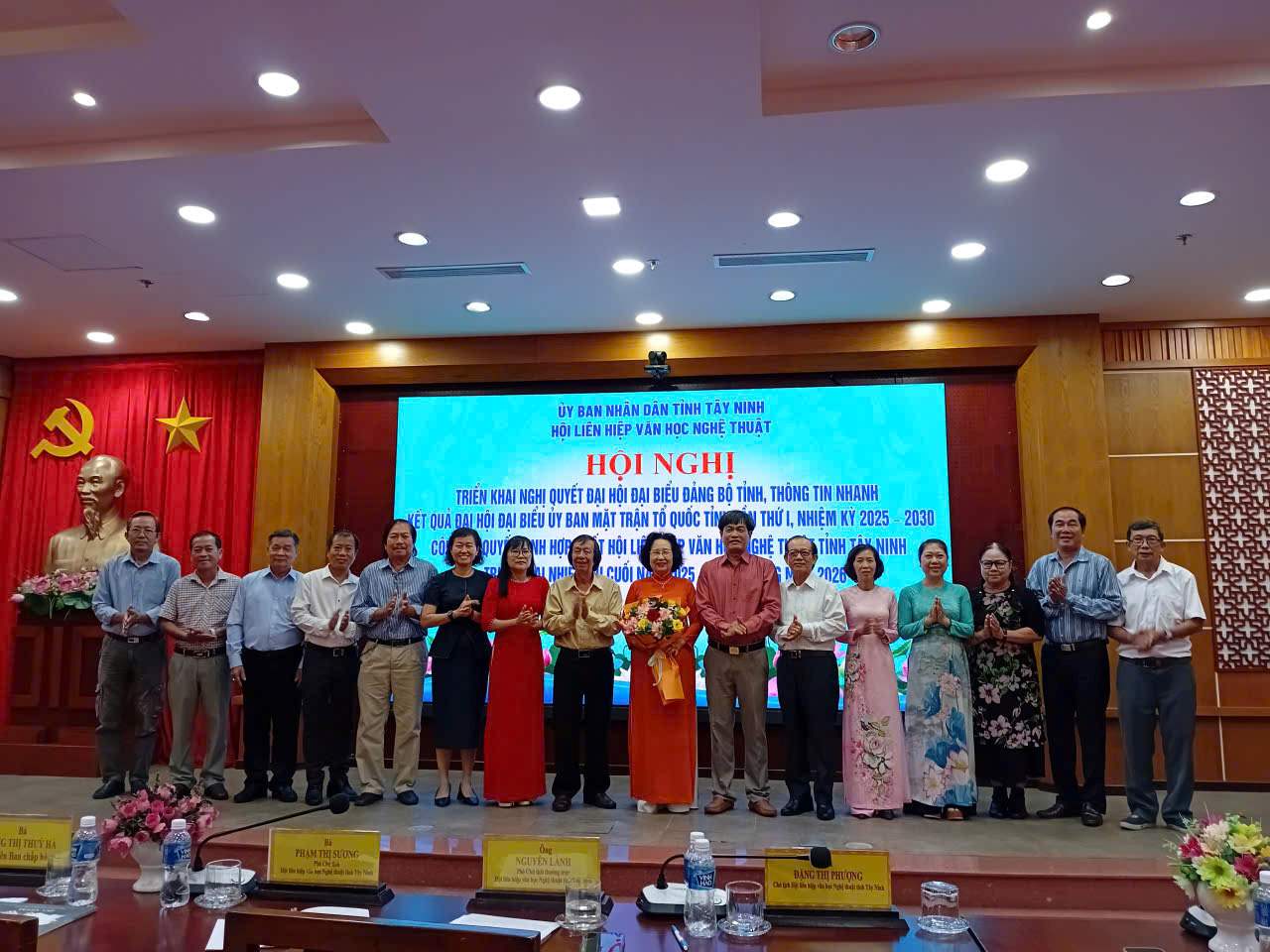 Ngày 3/12/2025, tại Hội trường Tỉnh ủy Tây Ninh cơ sở 2 (phường Tân Ninh, tỉnh Tây Ninh), Thường trực Hội Liên hiệp Văn học Nghệ thuật (VHNT) tỉnh Tây Ninh đã tổ chức Hội nghị triển khai Nghị quyết Đại hội Đại biểu Đảng bộ tỉnh Tây Ninh lần thứ I và thông tin nhanh kết quả Đại hội MTTQ tỉnh Tây Ninh lần thứ I. Đồng thời công bố Quyết định hợp nhất Hội Liên hiệp VHNT tỉnh Tây Ninh và triển khai nhiệm vụ cuối năm 2025 – định hướng năm 2026.
