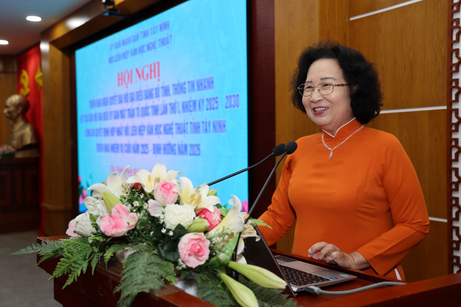 Bà Đặng Thị Phượng – Chủ tịch Hội Liên hiệp VHNT tỉnh Tây Ninh phát biểu tại hội nghị. Phó Chủ tịch Thường trực Hội Liên hiệp VHNT tỉnh Tây Ninh – ông Nguyễn Lành – đã công bố Quyết định của UBND tỉnh Tây Ninh về việc cho phép hợp nhất Hội VHNT tỉnh Tây Ninh và Hội Liên hiệp VHNT tỉnh Long An thành Hội Liên hiệp VHNT Tây Ninh kể từ ngày 1/7/2025. Công nhận bà Đặng Thị Phượng – Chủ tịch Hội VHNT tỉnh Tây Ninh giữ chức vụ Chủ tịch Hội Liên hiệp VHNT tỉnh Tây Ninh. Công nhận nhân sự Ban Chấp hành Hội Liên hiệp VHNT tỉnh Tây Ninh trên cơ sở hợp nhất nguyên trạng nhân sự Ban Chấp hành Hội Liên hiệp VHNT tỉnh Long An và nhân sự Ban Chấp hành Hội VHNT tỉnh Tây Ninh.
