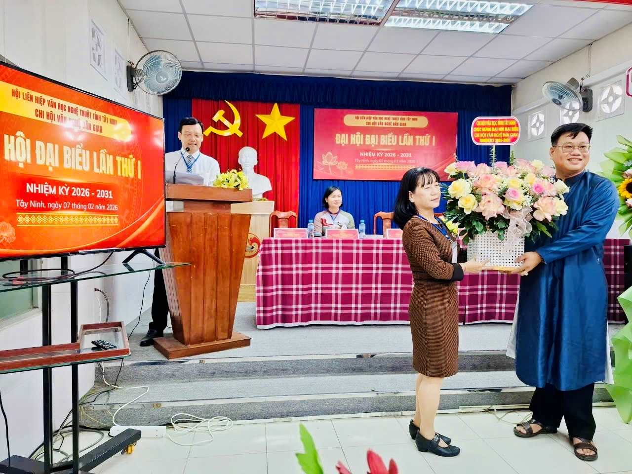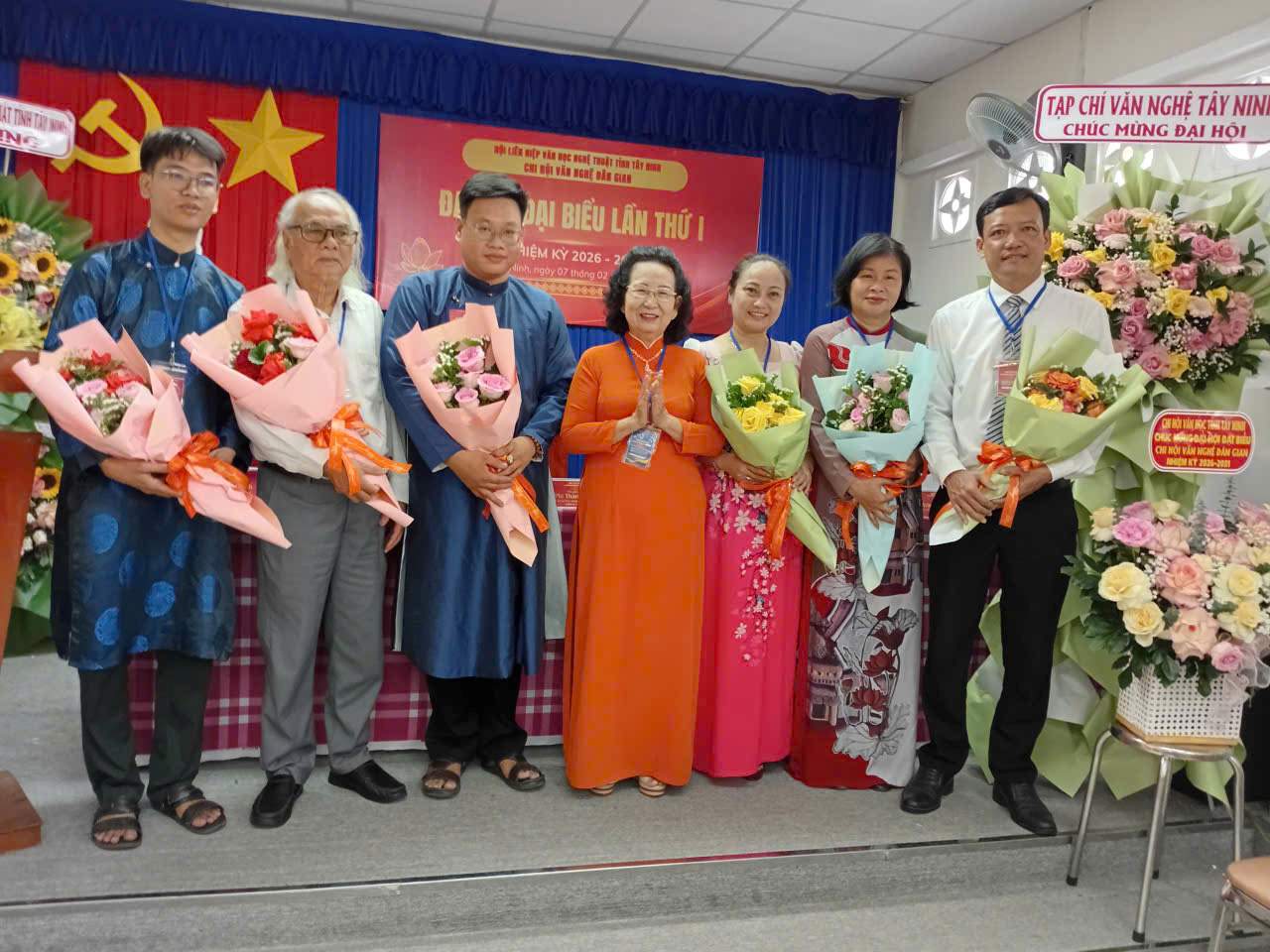 Nghệ sĩ Đặng Thị Phượng (thứ 3 từ trái qua) - Chủ tịch Hội Liên hiệp VHNT Tây Ninh - tăng lẵng hoa chúc mừng Đại hội