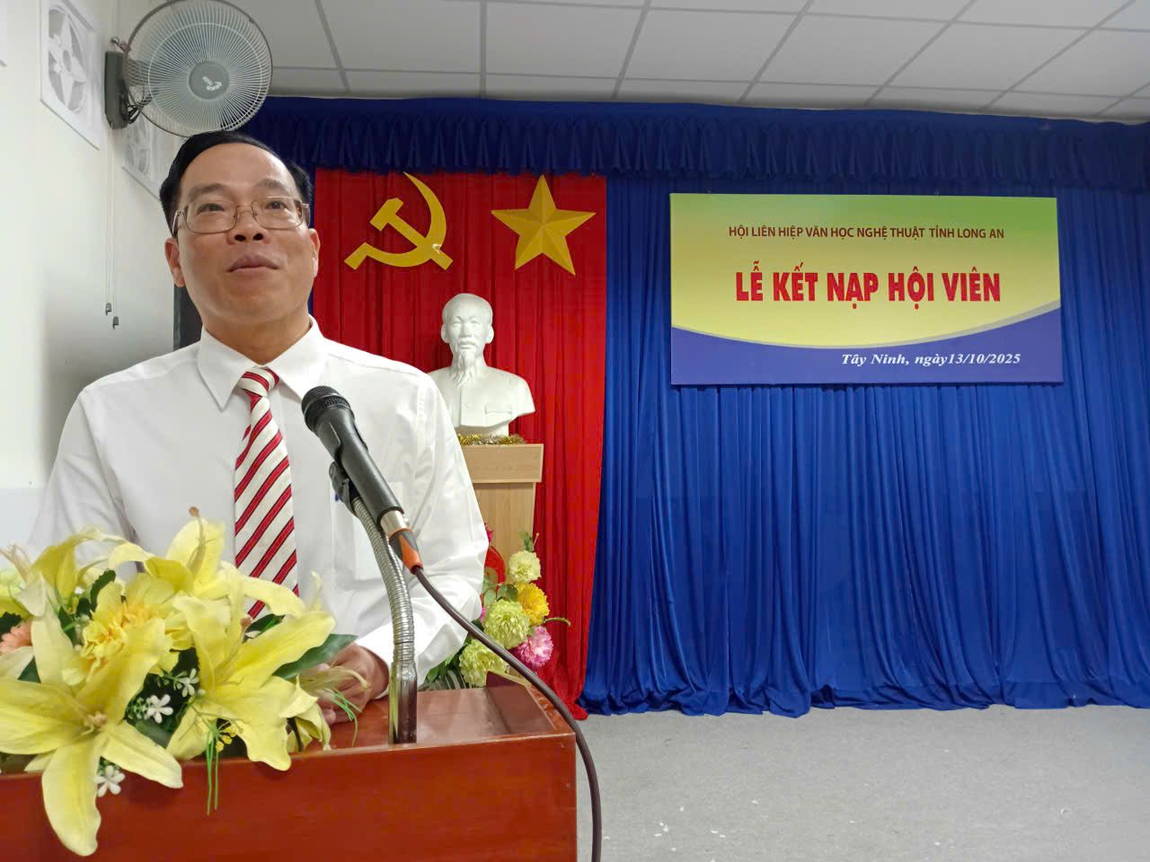 Hội viên Trần Quốc Khánh thay mặt các hội viên mới phát biểu tại Lễ kết nạp. Trong bài phát biểu tại Lễ kết nạp, nghệ sĩ nhiếp ảnh Nguyễn Lành – Phó Chủ tịch Thường trực Hội LHVHNT Long An – cho biết, hoạt động sân khấu ở tỉnh Long An trước đây, nay là Tây Ninh ngày càng khởi sắc, là điều kiện thuâbj lợi xuất hiện thêm nhiều nhân tố mới để được kết nạp vào Hội. Ông Lành cũng cho biết, hiện Hội LHVHNT Long An và Hội VHNT Tây Ninh đang chuẩn bị sáp nhập dể trở thành Hội LHVHNT tỉnh Tây Ninh.