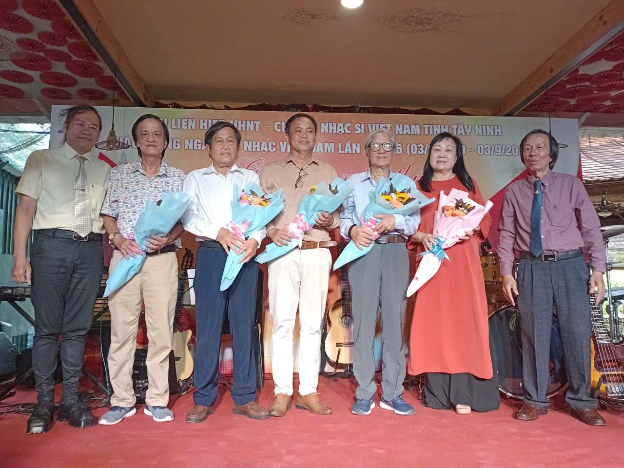 NS Nguyễn Quốc Tây - Chi hội trưởng Chi hội NSVN tỉnh Tây Ninh. Đến dự họp mặt có đồng chí: Nguyễn Thị Chung – Phó phòng Khoa giáo, văn hóa - văn nghệ, Ban Tuyên giáo và Dân vận Tỉnh ủy Tây Ninh; Thượng tá Phan Thị Tường Vi – Trưởng phòng An ninh chính trị nội bộ, Công an tỉnh; NSNA Nguyễn Lành - Phó Chủ tịch thường trực Hội Liên hiệp VHNT tỉnh; Nghệ nhân Nguyễn Văn Chiểu, Phó Chủ tịch Hội Liên hiệp VHNT tỉnh; Thạc sĩ, nhạc sĩ Trầm Tích – đại diện thường trực phía Nam, Hội NSVN; Phó Giáo sư, tiến sĩ, nhạc sĩ Thế Bảo; cùng các nhạc sĩ khách quý đến từ TP.HCM.