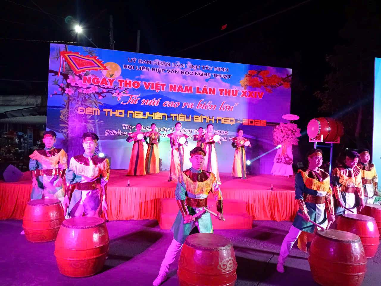 Lễ khai mạc Ngày Thơ Việt Nam lần thứ 24 – Đêm thơ Nguyên tiêu Bính Ngọ 2026 được tổ chức trang trọng tại đường Trần Hưng Đạo, cạnh rạch Tây Ninh. Sau nghi thức khai mạc là màn múa trống hội trên nền nhạc diễn ngâm hai thi phẩm bất hủ “Nam quốc sơn hà” và “Nguyên tiêu”, tiếp nối bằng phát biểu khai mạc, đánh trống khai hội và chương trình Thơ – Nhạc đặc sắc gồm 12 tiết mục: diễn ngâm, đọc thơ, đờn ca tài tử, diễn xướng dân gian, múa bóng rỗi, vọng cổ, hát múa…