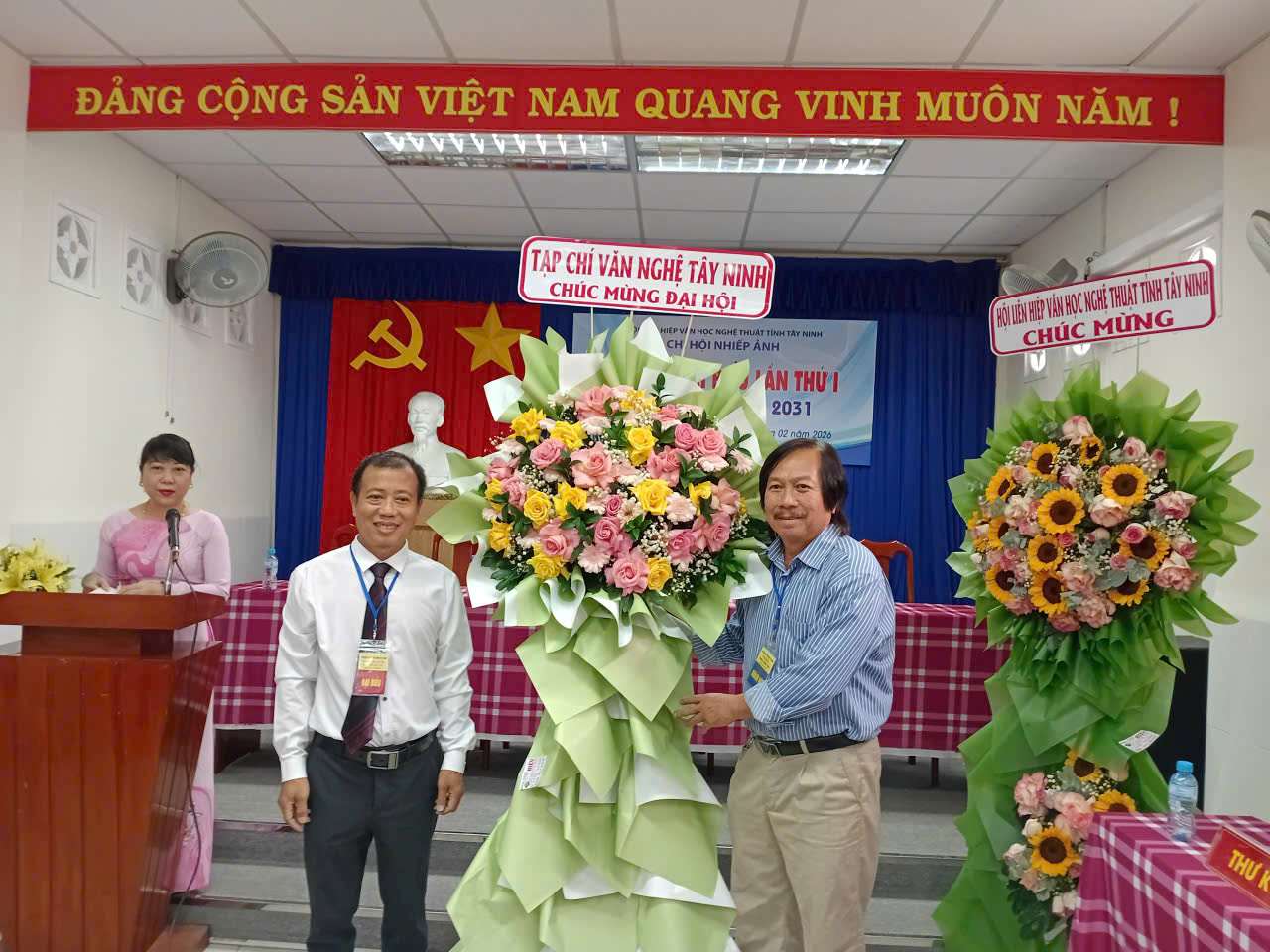 Bà Đặng Thị Phượng - Chủ tich và ông Nguyễn Lành - Phó Chủ ttịch Thường trực Hội Liên hiệp VHNT Tây Ninh tặng hoa chúc mừng Ban Chấp hành Chi hội Nhiếp ảnh nhiệm kỳ mới Chi hội đặc biệt quan tâm đến chiều sâu nghệ thuật của các hoạt động sáng tác. Với tinh thần yêu nghề và niềm đam mê chân chính dành cho nhiếp ảnh, các hội viên luôn miệt mài lao động nghệ thuật, không đặt nặng lợi ích vật chất, mà lấy giá trị sáng tạo và cống hiến cho đời sống văn hóa làm mục tiêu xuyên suốt. Sự say mê ấy đã trở thành động lực bền bỉ, lan tỏa từ gia đình ra xã hội và ngày càng được cộng đồng ghi nhận, đánh giá cao. Thông qua quá trình hoạt động nghiêm túc và bền bỉ, nhiều hội viên đã được công nhận trình độ chuyên môn, đạt các chứng chỉ nghề theo quy định, góp phần khẳng định tính chuyên nghiệp, uy tín và vị thế của Chi hội trong đời sống văn hóa – nghệ thuật của tỉnh.