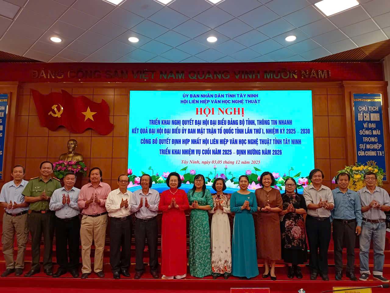 Ngày 5/12/2025, tại Hội trường Tỉnh ủy Tây Ninh cơ sở 1 (phường Long An, tỉnh Tây Ninh), Thường trực Hội Liên hiệp Văn học Nghệ thuật (VHNT) tỉnh Tây Ninh đã tổ chức Hội nghị triển khai Nghị quyết Đại hội Đại biểu Đảng bộ tỉnh Tây Ninh lần thứ I và thông tin nhanh kết quả Đại hội MTTQ tỉnh Tây Ninh lần thứ I. Đồng thời công bố Quyết định hợp nhất Hội Liên hiệp VHNT tỉnh Tây Ninh và ra mắt Ban Chấp hành Hội.
