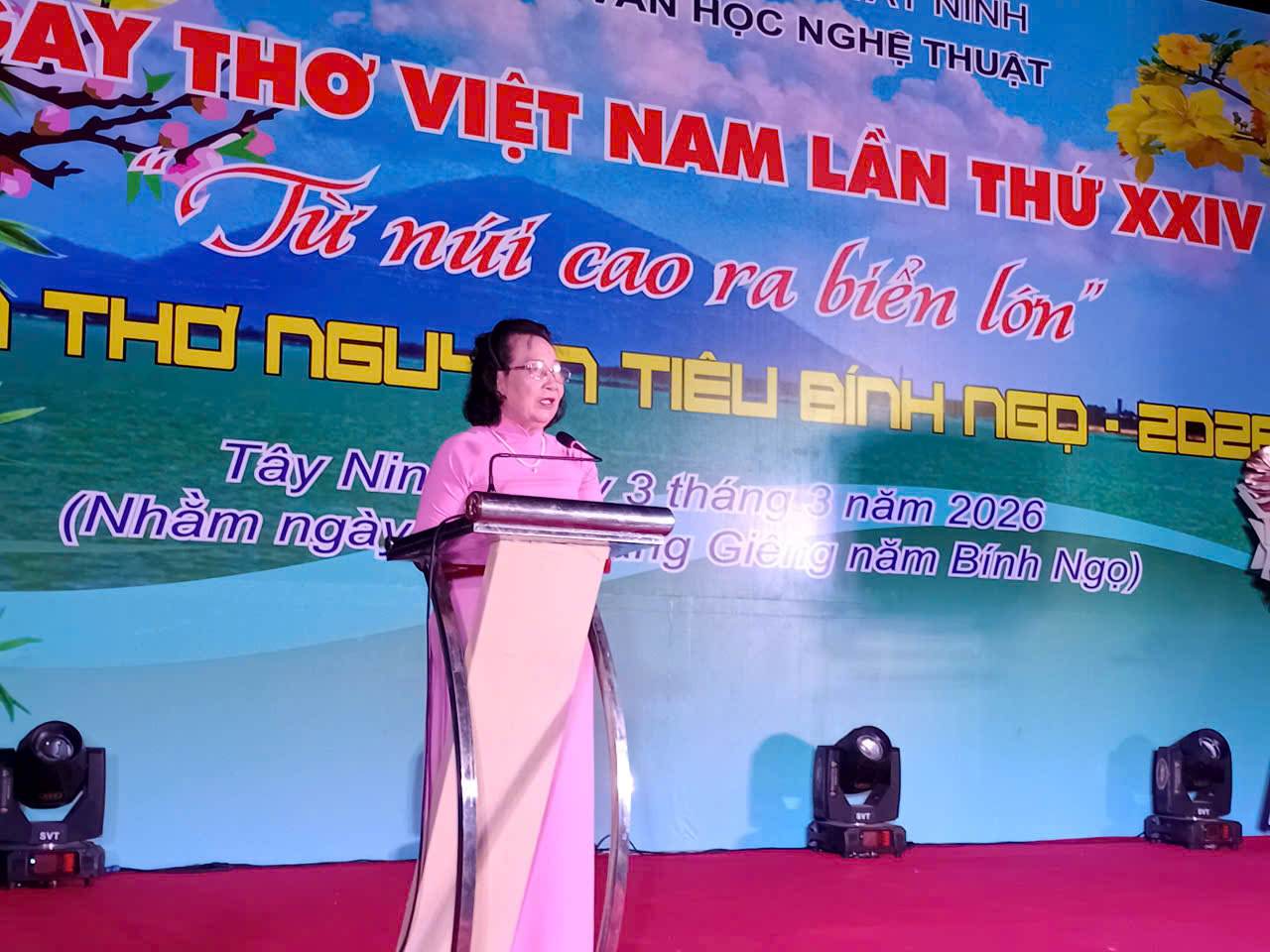 Chủ tịch Hội Liên hiệp VHNT Tây Ninh - nghệ sĩ Đặng Thị Phượng - phát biểu khai mạc Đêm thơ