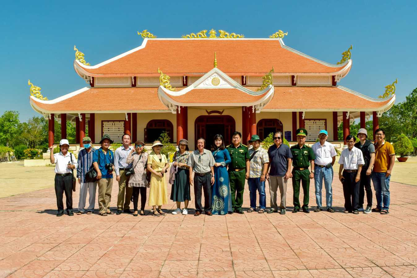 Du khách chụp ảnh lưu niệm sau khi viếng thăm, tưởng niệm tri ân các anh hùng liệt sỹ tại Đền thờ liệt sỹ Long Khốt.